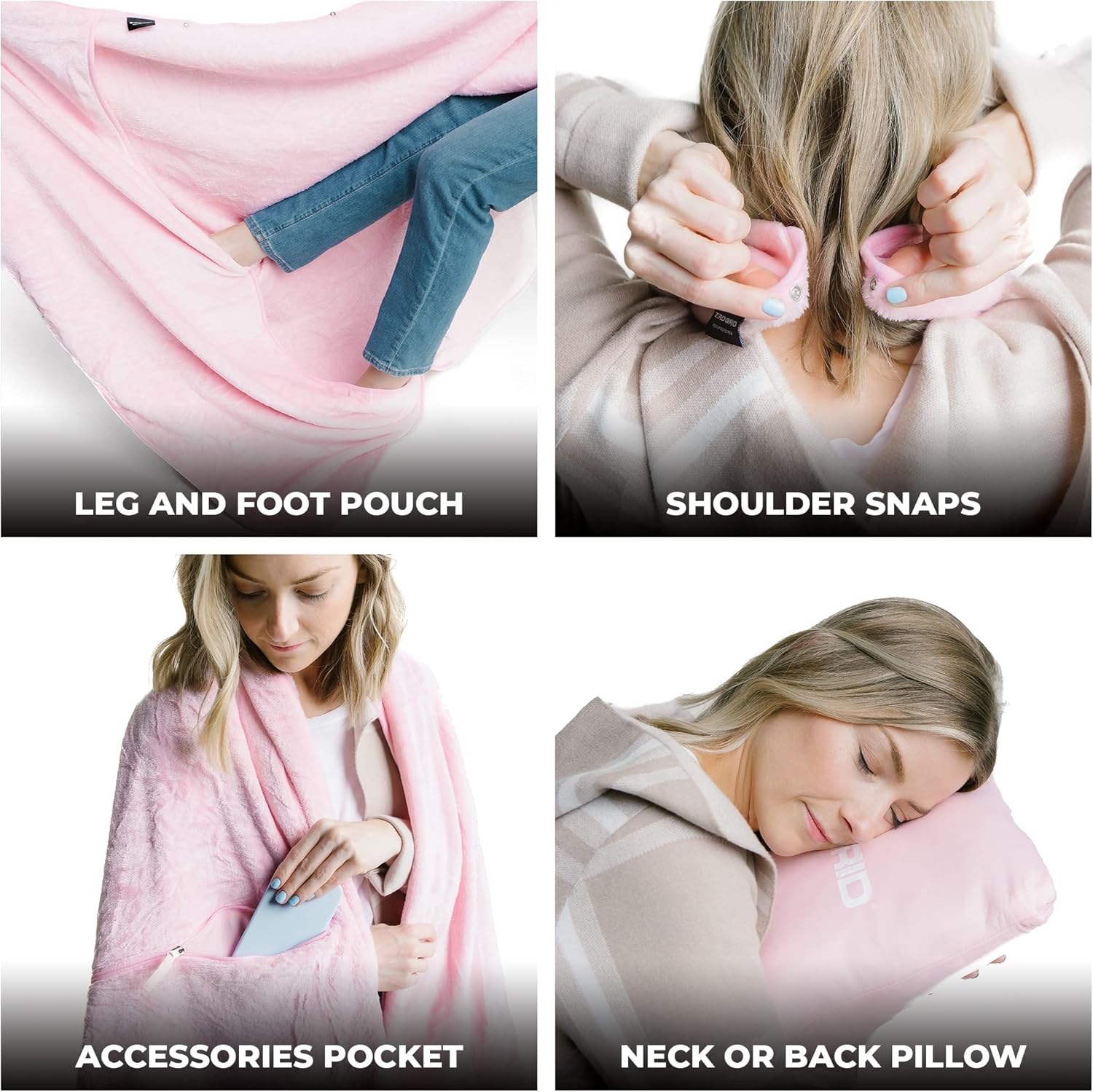 Lightweight Travel Blanket - Premium & Compact Airplane Wearable Blanket with Neck Snaps, Cozy Foot Pockets, Zipper Pouch - Converts into Soft Pillow - Designed for Ultimate Comfort - Rose